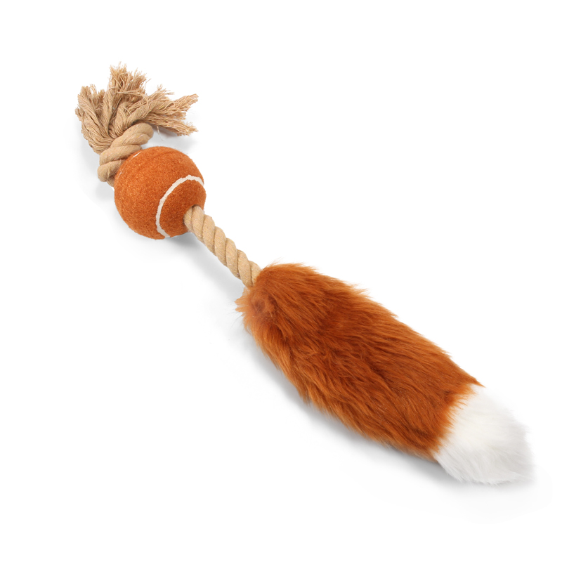 Игрушка для собак в виде мячика дополнена хвостиком из искусственного меха и веревкой. Сам мячик выполнен из прочной теннисной резины и оснащен пищалкой для привлечения внимания питомца.