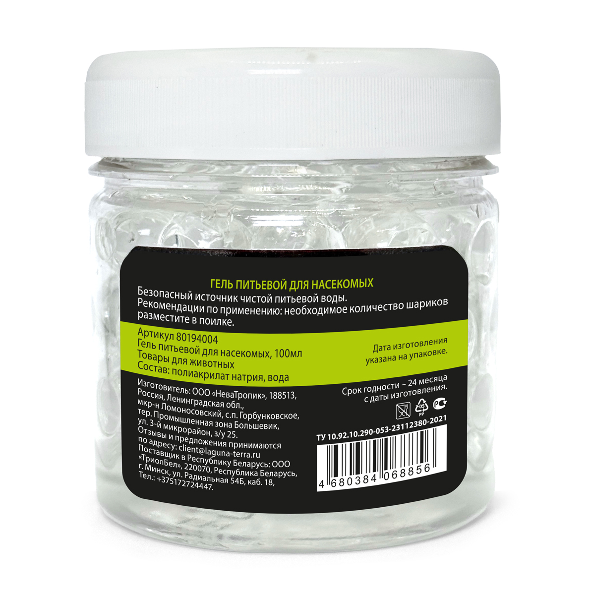 Питьевой гель для насекомых – безопасный источник чистой питьевой воды для сверчков, тараканов и прочих кормовых насекомых. Применение питьевого геля полностью исключает возможность насекомых утонуть в поилке. Питьевой гель выпускается в виде шариков, сохраняющих свою форму до полного высыхания и уменьшения в объеме. Гель не повышает влажность в террариуме или инсектариуме. Рекомендации по применению: Необходимое количество шариков разместите в поилке и обеспечьте доступ насекомых к шарикам Питьевого геля. По мере высыхания шариков геля добавляйте свежие, чтобы у кормовых насекомых был постоянный доступ к питью.