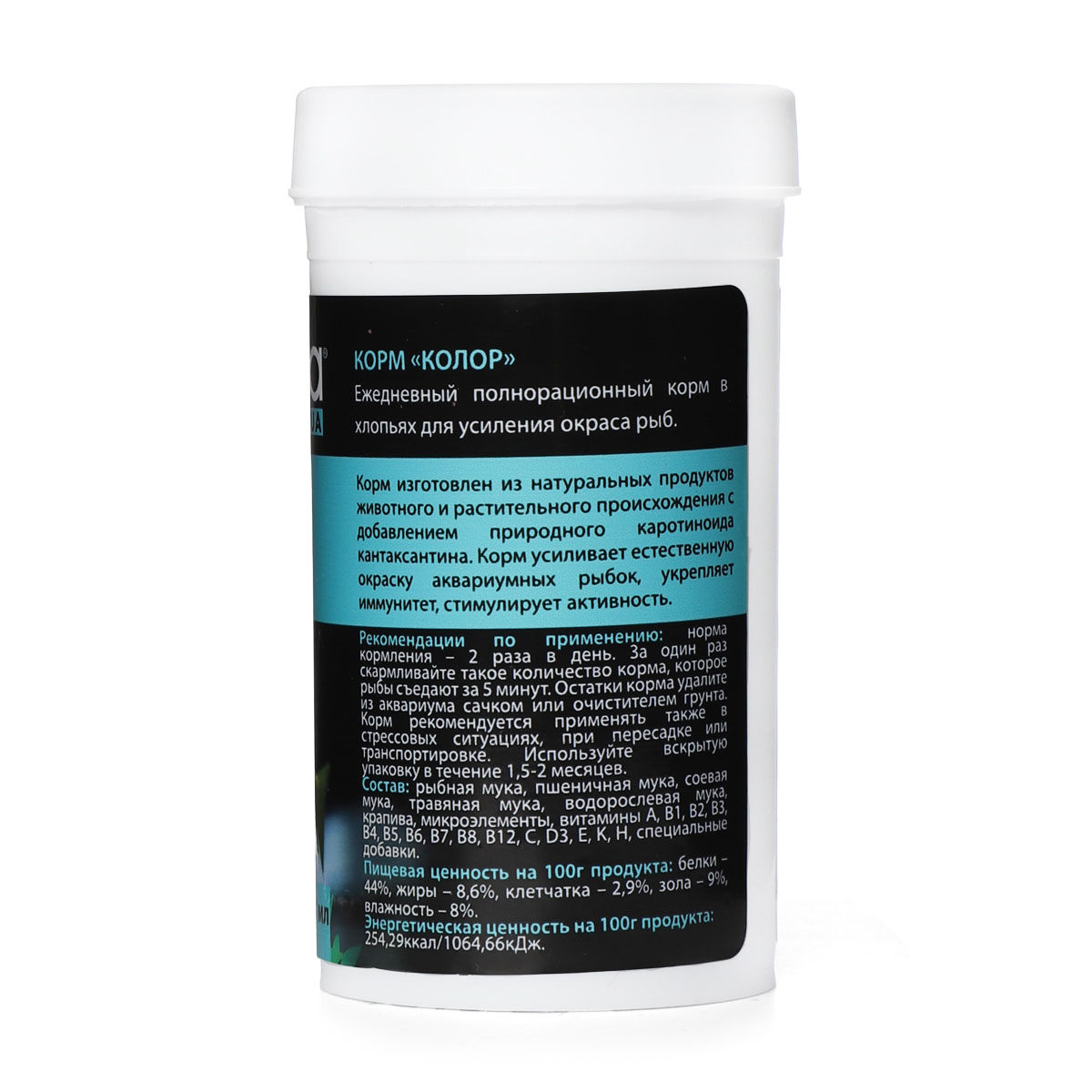 Ежедневный корм в виде хлопьев «Колор» служит для усиления естественной окраски аквариумных рыб. Корм подходит для большинства аквариумных обитателей. Входящий в состав природный каротиноид кантаксантин усиливает окраску рыб, является антиоксидантом, укрепляет здоровье, иммунитет и улучшает репродуктивную функцию.