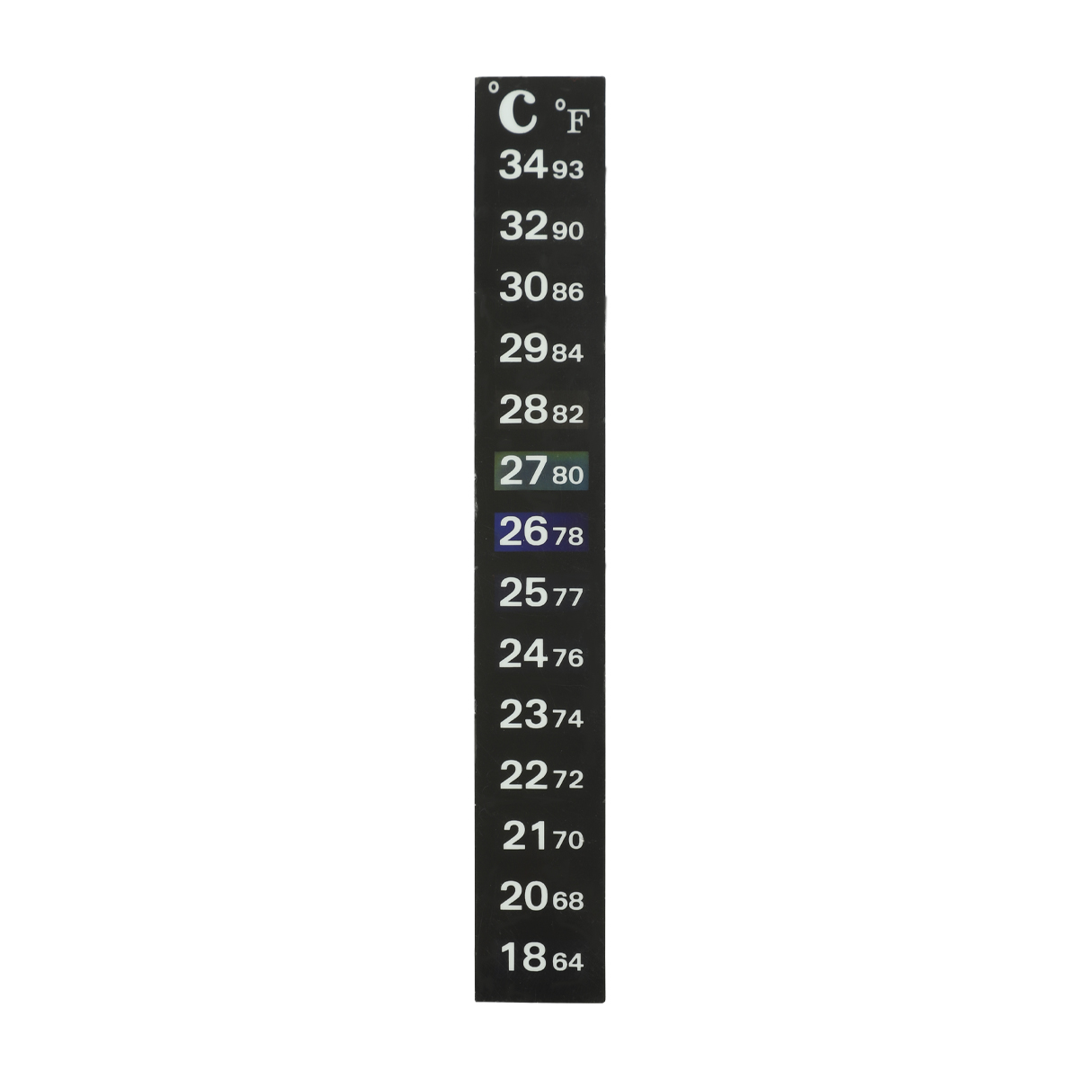 Термометр жидкокристаллический самоклеящийся 18-34 °C - наклейка-термометр. Наклейка имеет 2 цветные температурные шкалы - Цельсия °C и Фаренгейта °F, измеряемый термометром диапазон от +18°С до +34°С и от +64 °F до 93 °F. Показания текущей температуры располагаются в прямоугольнике зеленого цвета. Если зеленый цвет на термометре отсутствует, то текущая температура — среднее между значениями на синем и коричневом прямоугольнике (см. рис.). Влагостойкая цветная ЖК шкала позволяет легко снимать показания с термометра. Характеристики: Цена деления: 1°C; Диапазон измерений: 18-34 °C и 64-93 °F