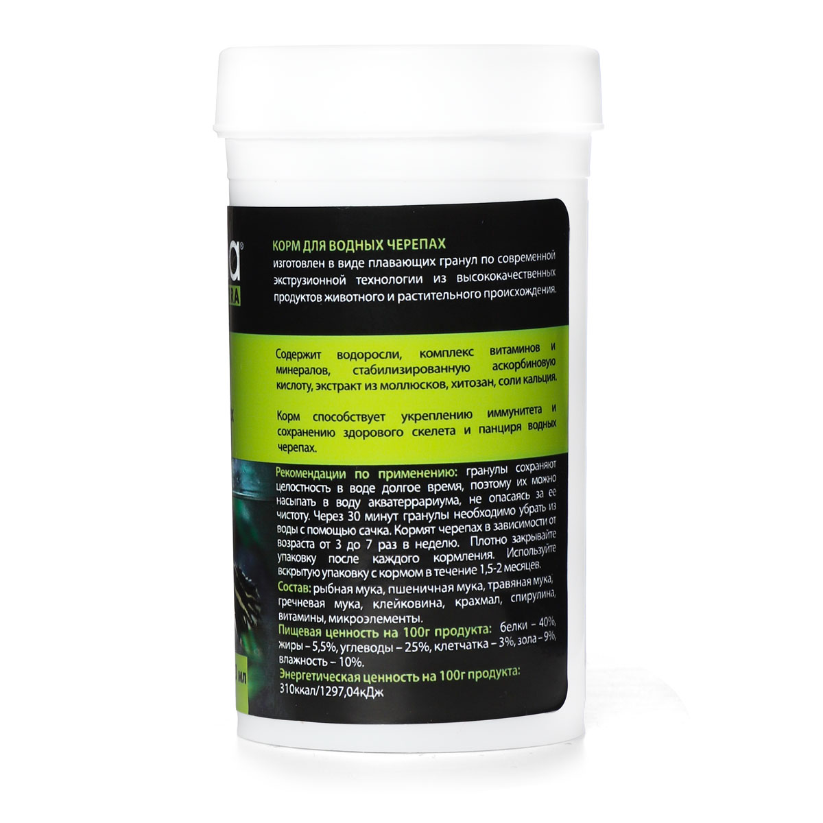 Корм для водных черепах изготовлен в виде плавающих гранул по современной экструзионной технологии из высокачественных продуктов животного и растительного происхождения. Корм содержит водоросли, комплекс витаминов и минералов, стабилизированную аскорбиновую кислоту, экстракт из моллюсков, хитозан, соли кальция. Корм способствует укреплению иммунитета и сохранению здорового скелета и панциря водных черепах.