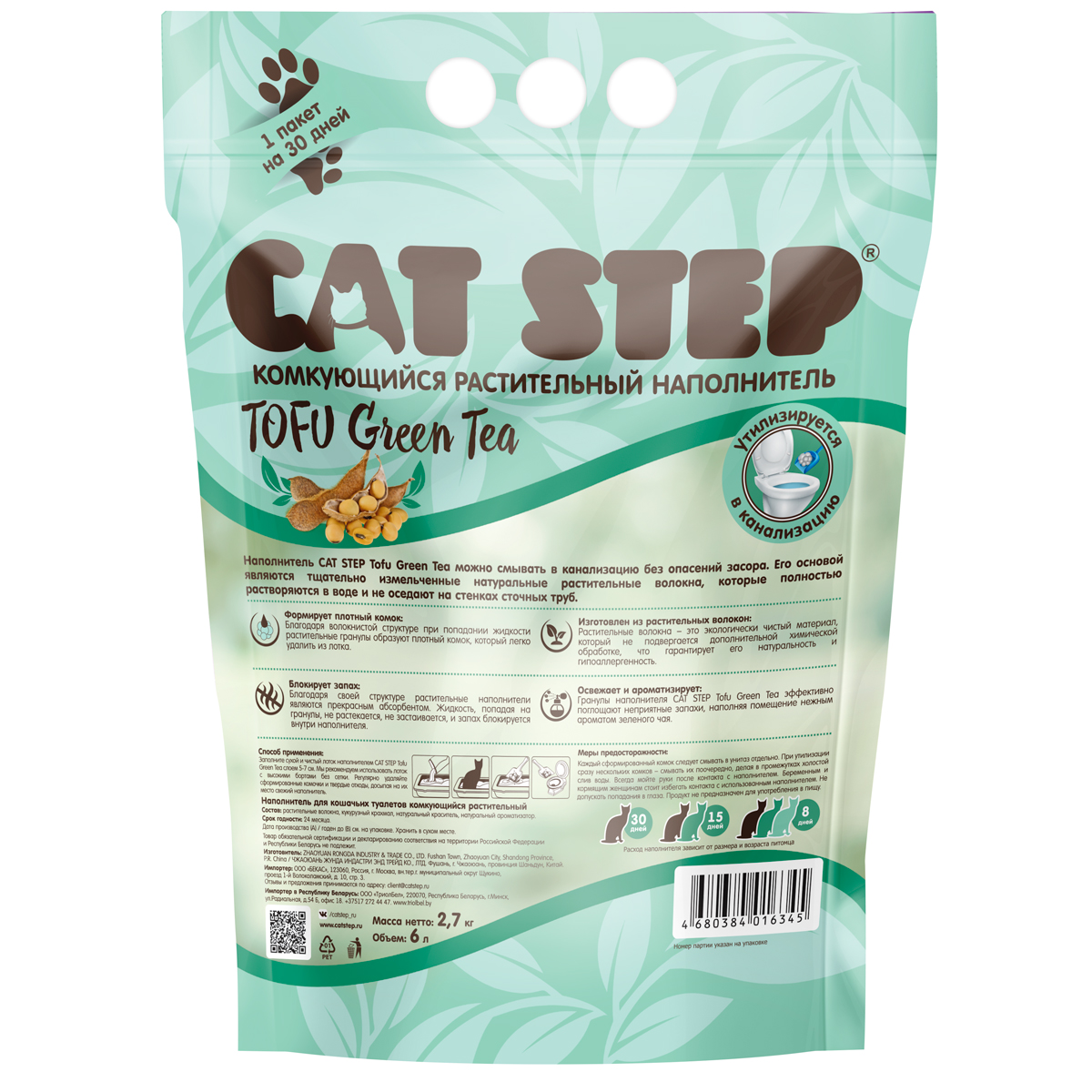Растительные волокна, которые являются основой наполнителя CAT STEP Tofu Green Tea, легко растворяются в воде, поэтому его можно смывать в канализацию без опасений. Растительные волокна – это натуральный и экологически чистый материал, который не подвергается химической обработке, что гарантирует его гипоаллергенность и безопасность для питомцев и их хозяев. Благодаря волокнистой структуре при попадании жидкости растительные гранулы образуют плотный комок, который легко удалить из лотка. Жидкость, попадая на гранулы, не растекается, не застаивается, и запах блокируется внутри наполнителя. Легкий аромат зеленого чая освежает помещение, а оригинальный оттенок наделяет продукт особой эстетикой. Заполните сухой и чистый лоток наполнителем CAT STEP Tofu Green Tea слоем 5-7 см. Регулярно удаляйте комочки и экскременты, досыпая на их место свежий наполнитель. Использованный наполнитель можно смывать в унитаз. Объем: 6 л.
