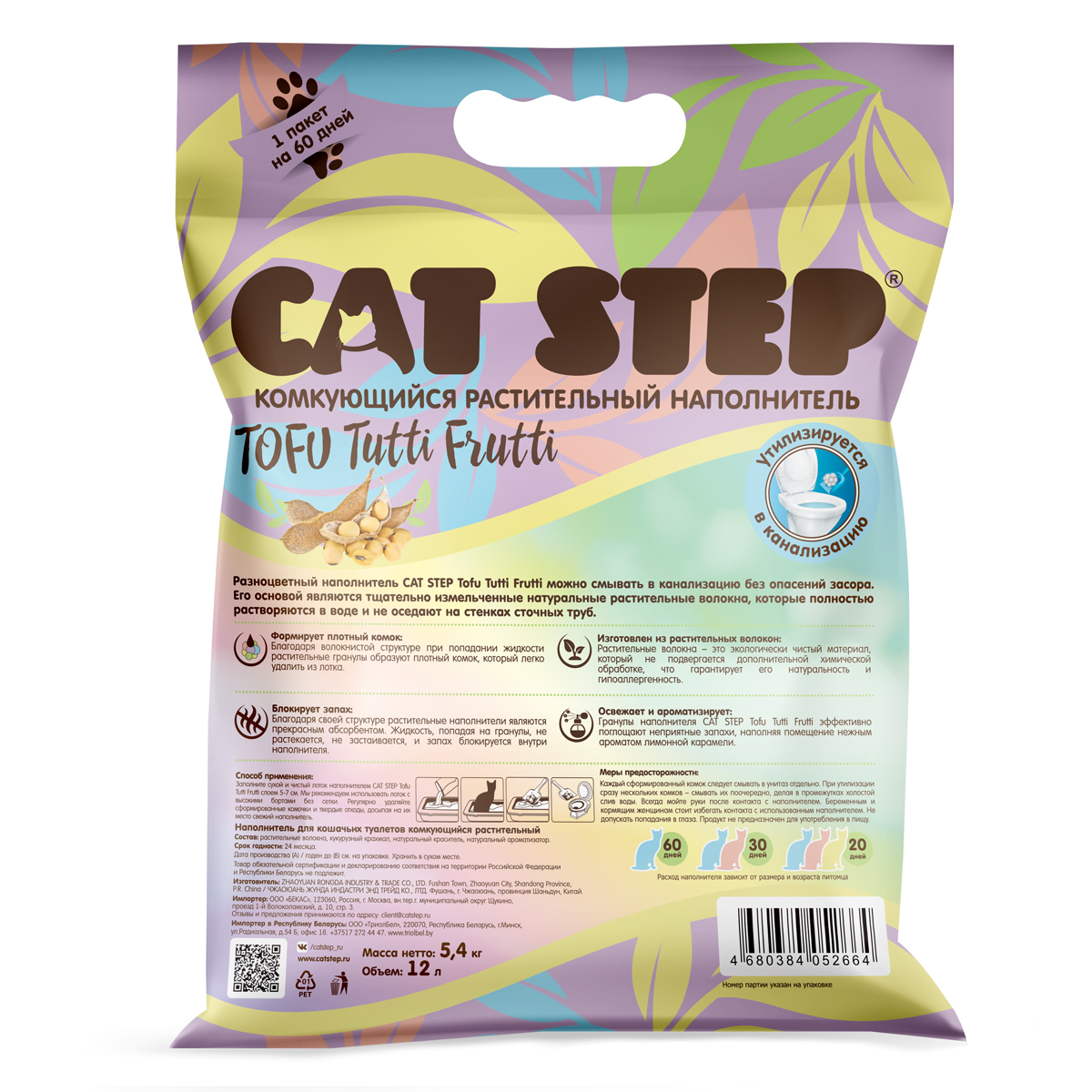 Растительные волокна, которые являются основой наполнителя CAT STEP Tofu Tutti Frutti, легко растворяются в воде, поэтому его можно смывать в канализацию без опасений. Растительные волокна – это натуральный и экологически чистый материал, который не подвергается химической обработке, что гарантирует его гипоаллергенность и безопасность для питомцев и их хозяев. Благодаря волокнистой структуре при попадании жидкости соевые гранулы образуют плотный комок, который легко удалить из лотка. Жидкость, попадая на гранулы, не растекается, не застаивается, и запах блокируется внутри наполнителя. Разноцветные гранулы нежных оттенков поднимут настроение хозяину и освежат помещение легким ароматом лимонной карамели. Заполните сухой и чистый лоток наполнителем CAT STEP Tofu Tutti Frutti слоем 5-7 см. Регулярно удаляйте комочки и экскременты, досыпая на их место свежий наполнитель. Использованный наполнитель можно смывать в унитаз. Объем: 12 л.