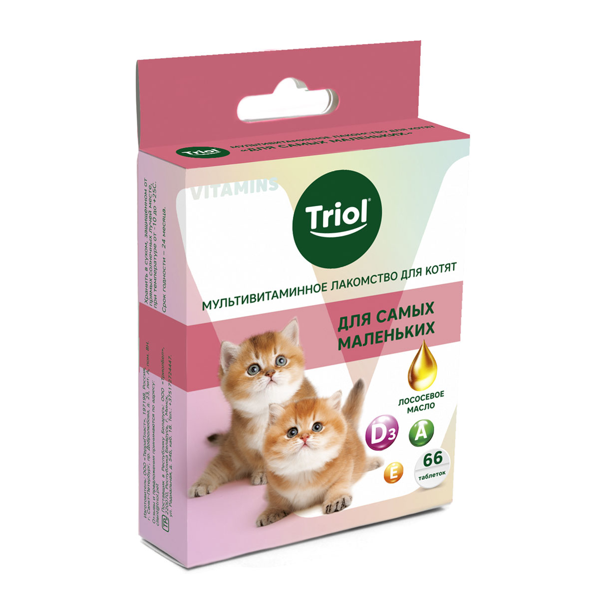 Мультивитаминное лакомство для котят «Для самых маленьких» TRIOL – это источник полезных веществ, необходимых для здорового роста и формирования организма котенка. Лососевое масло содержит незаменимые жирные кислоты омега-3, которые влияют на развитие мозга, иммунной системы и зрения. Омега-3 также поддерживает здоровье и красоту кожи и шерсти: увлажняет и защищает от негативных факторов окружающей среды. Витамин А участвует в формировании костей и хрящей котенка, активно влияет на выстраивание здорового иммунитета, так как помогает бороться с бактериями и вирусами. Витамин D3 играет ключевую роль в усвоении кальция и фосфора – укрепляет зубы и опорно-двигательный аппарат. Активные компоненты лакомства влияют на общее развитие питомца: поддерживают формирование иммунитета, укрепляют кости, суставы и связки, а также заботятся о коже, шерсти и зрении питомца.