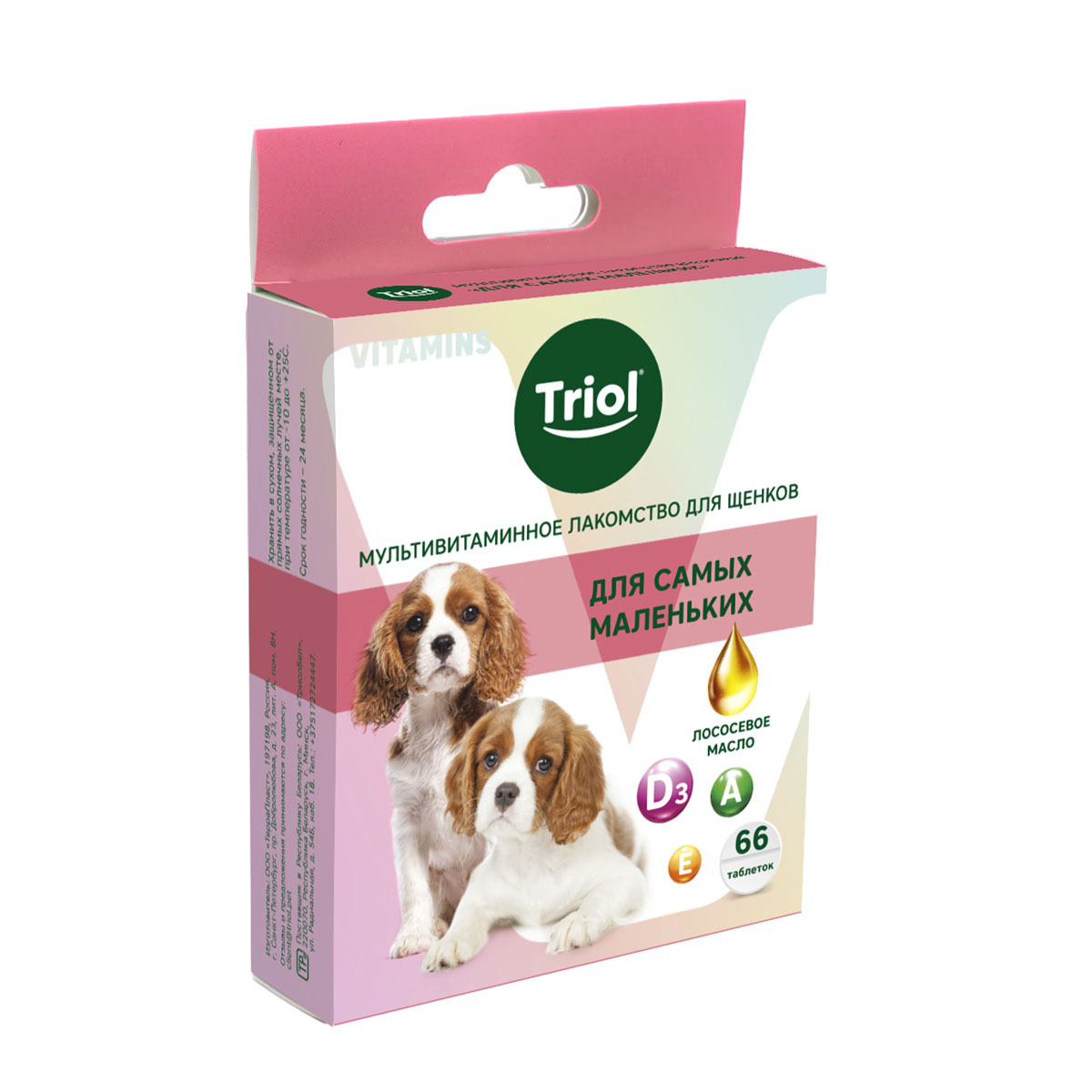 Мультивитаминное лакомство для щенков «Для самых маленьких» TRIOL – это источник полезных веществ, необходимых для здорового роста и формирования организма щенка. Лососевое масло содержит незаменимые жирные кислоты омега-3, которые влияют на развитие мозга, иммунной системы и зрения. Омега-3 также поддерживает здоровье и красоту кожи и шерсти: увлажняет и защищает от негативных факторов окружающей среды. Витамин А участвует в формировании костей и хрящей щенка. Он активно влияет на выстраивание здорового иммунитета, так как помогает бороться с бактериями и вирусами. Витамин D3 играет ключевую роль в усвоении кальция и фосфора – укрепляет зубы и опорно-двигательный аппарат. Активные компоненты лакомства влияют на общее развитие питомца: поддерживают формирование иммунитета, укрепляют кости, суставы и связки, а также заботятся о коже, шерсти и зрении питомца.