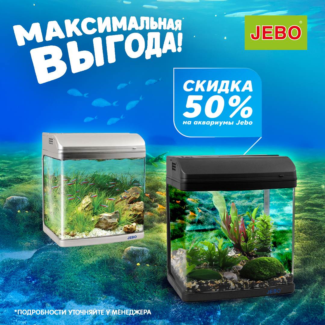 В период с 6 по 31 октября при покупке аквариумов торговой марки Jebo из акционного ассортимента активируется скидка 50% от базовых цен.