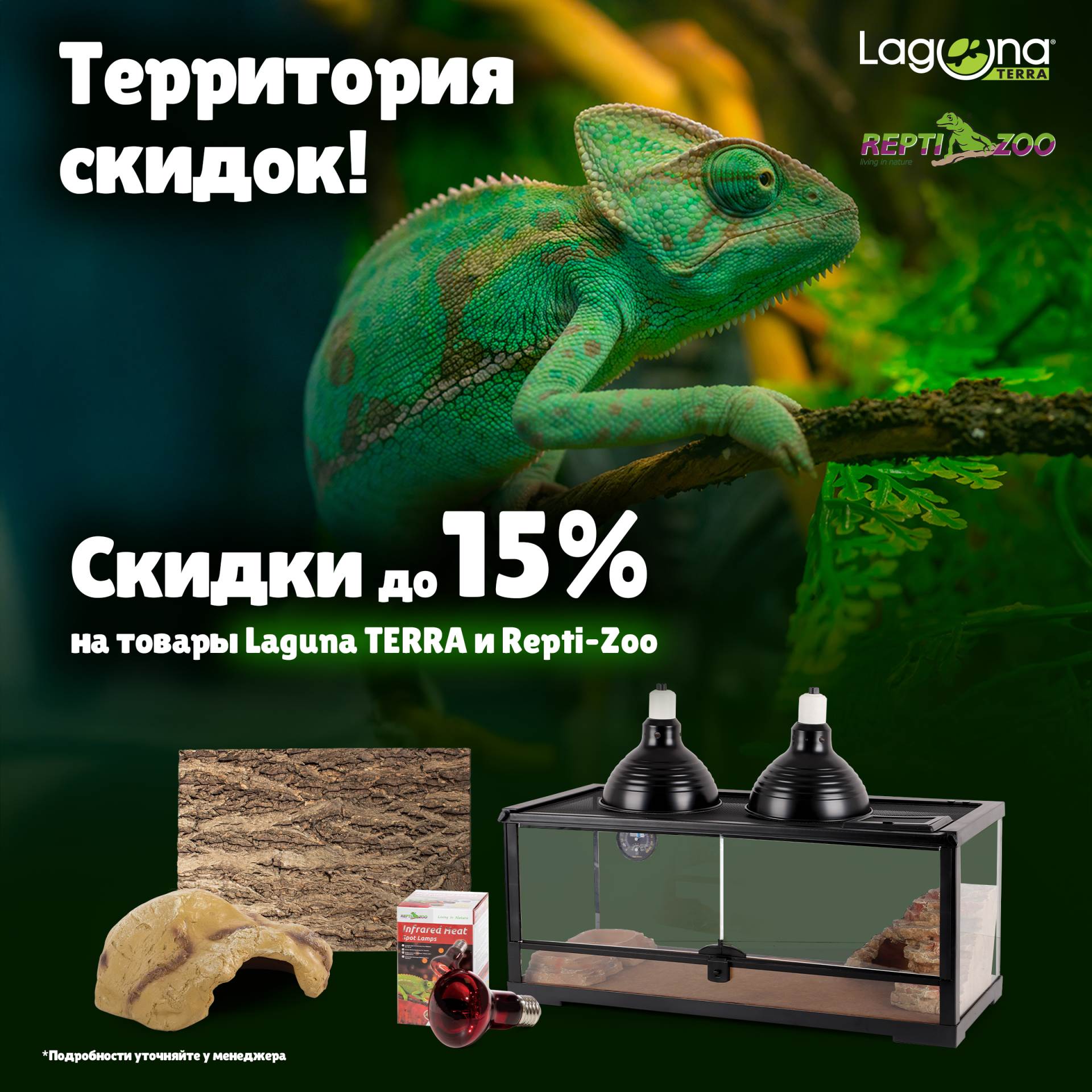 Только с 6 по 31 октября будет действовать выгодное предложение на террариумное оборудование, аксессуары и декорации от брендов Repti-Zoo и Laguna TERRA. При покупке 3 SKU из акционного ассортимента активируется дополнительная скидка до -10%, а при покупке от 6 SKU скидка возрастает до -15%.