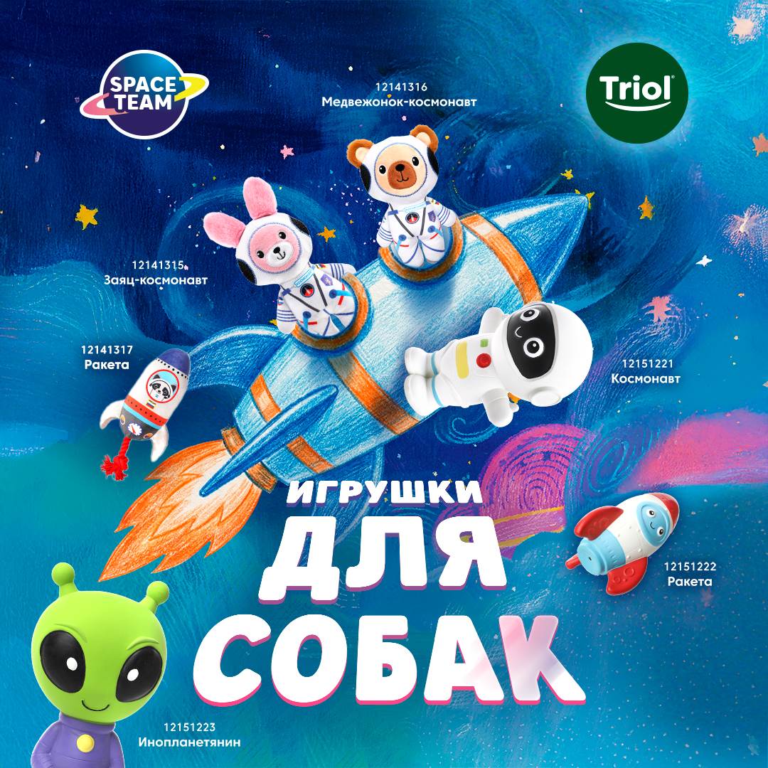 12 апреля вся страна вспоминает великий подвиг — первый полёт человека в космос. Но задолго до Юрия Гагарина дорогу к звёздам проложили четвероногие первопроходцы. Именно им, отважным собакам-космонавтам, посвящена новая капсульная коллекция игрушек Triol Space Team. Вдохновляясь подвигом первых покорителей невесомости, мы создали игрушки, которые несут в себе дух приключений, смелости и энергию бескрайнего космоса. В коллекции — шесть ярких персонажей, каждый из которых готов отправиться с вашим питомцем навстречу звёздам! Космический десант Triol Space Team: