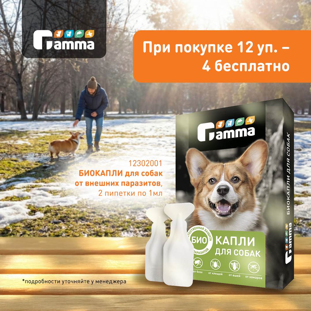 Не упустите выгоду! Только в период с 18 февраля по 31 марта при покупке 12 упаковок антипаразитарных БИОКАПЕЛЬ Gamma для собак еще 4 упаковки предоставляются бесплатно!